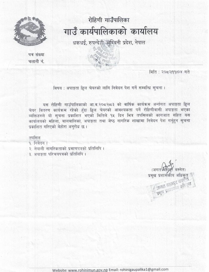 अपाङ्गता ह्विल चेयरको लागि निवेदन पेश गर्ने सम्बन्धमा।