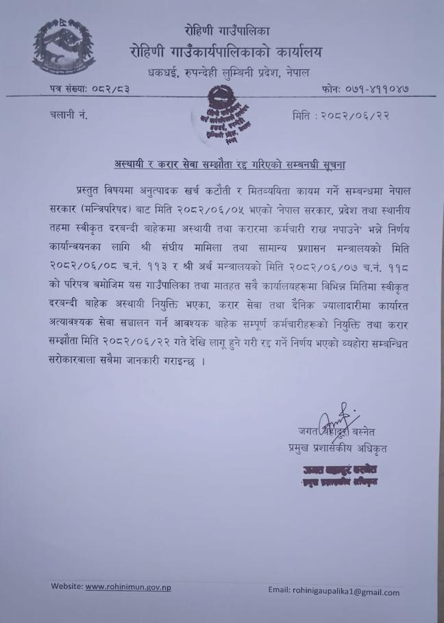 अस्थाइ र सेवा करार सम्झौता रद्द गरिएको सम्बन्धमा !