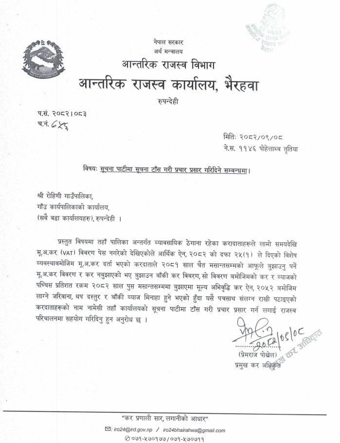आन्तरिक राजस्व कार्यालय भैरहवाको सूचना।