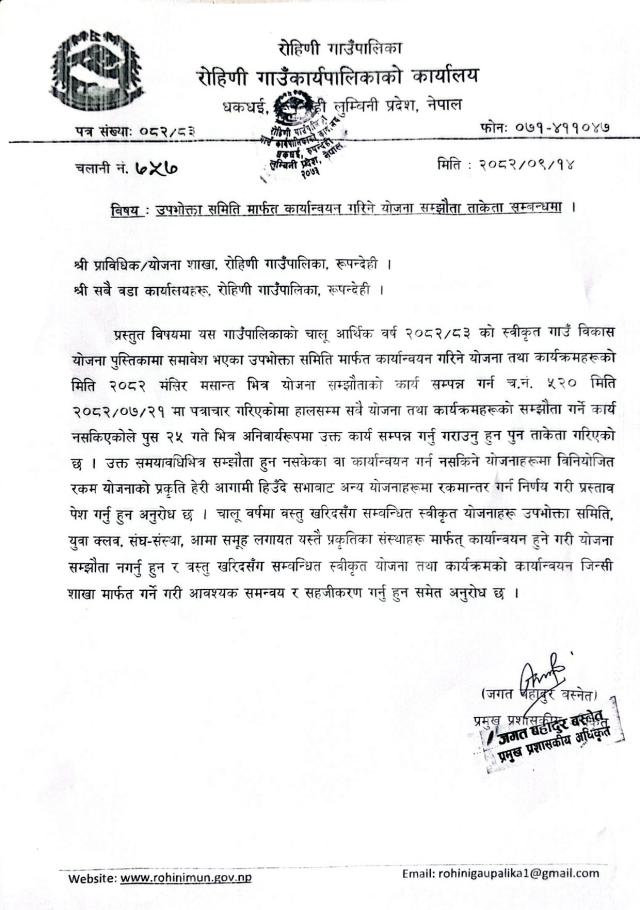 उपभोक्ता समिति मार्फत कार्यान्वयन गरिने योजना सम्झौता ताकेता सम्बन्धमा।