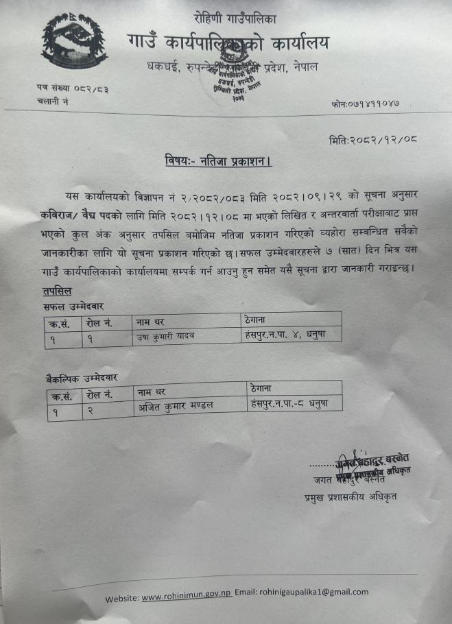 कविराज/वैद्य पदको नतिजा प्रकाशन !