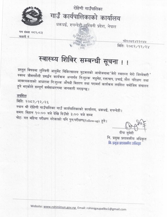 स्वस्थ्य शिविर सम्बन्धी सूचना !!!