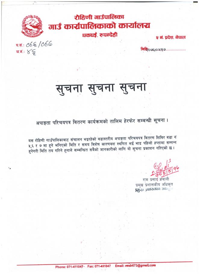 अपाङ्गता परिचयपत्र वितरण कार्यक्रमको तालिम हेरफेर सम्बन्धी सूचना ।