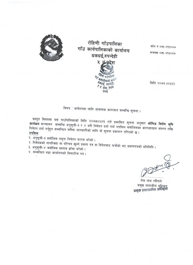 कोभिड विशेष कृषी कर्यक्रमको अावेदनका लागि अावश्क कागजात सम्बन्धि सूचना !