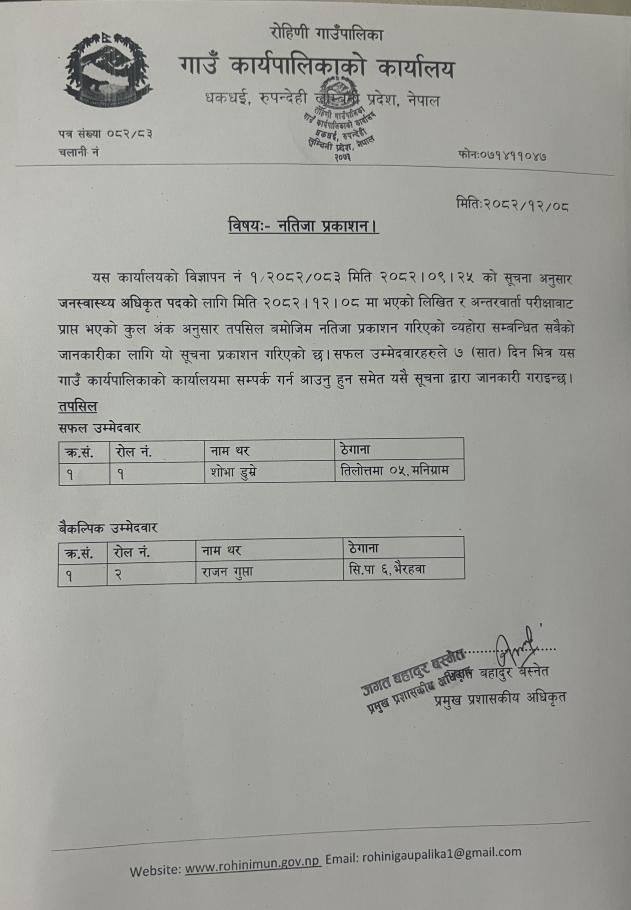 जनस्वास्थ्य अधिक्रत पदको नतिजा प्रकाशन सम्बन्धी सूचना !