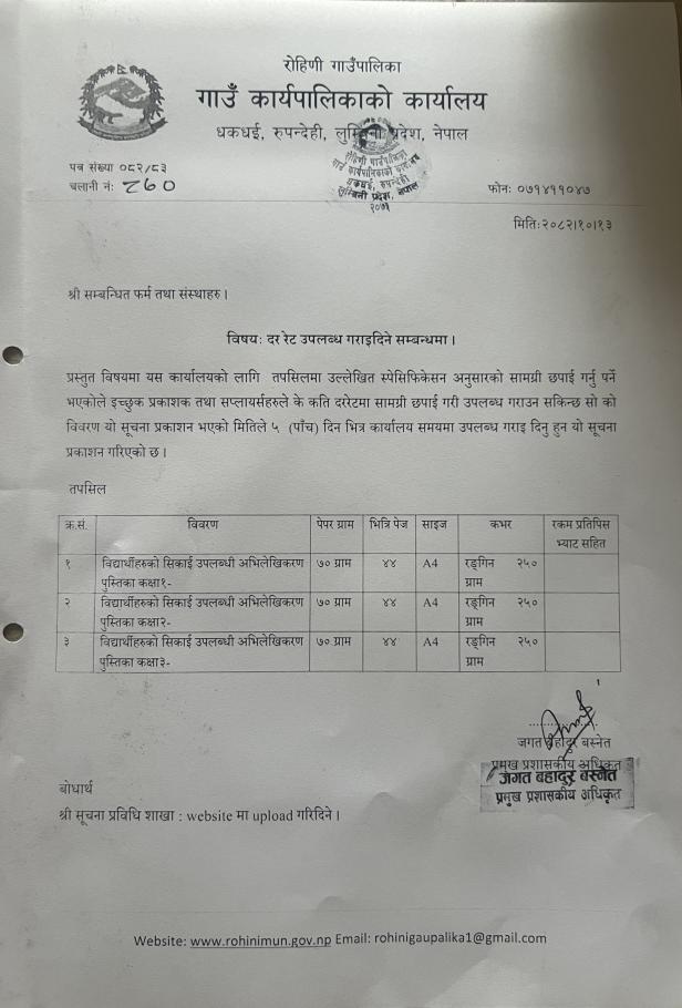 दर रेट उपलब्ध गराइदिने सम्बन्धमा