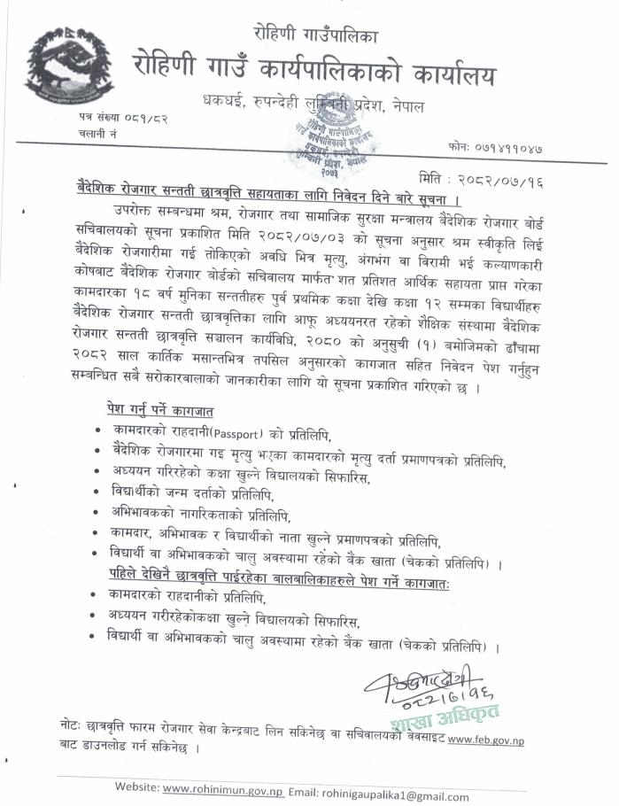 बैदेशिक रोजगार छात्रवृति सहायताका लागि निवेदन दिने बारे सूचना ।