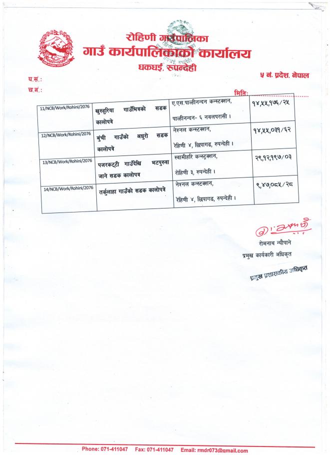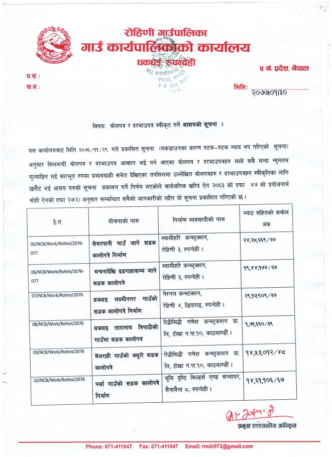 बोलपत्र र दरभाउ पत्र स्वीकृति गर्ने आशयको सम्बन्धी सूचना !!!