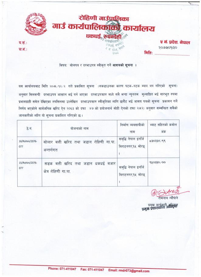 बोलपत्र र दरभाउ पत्र स्वीकृति गर्ने आशयको सम्बन्धी सूचना !!!