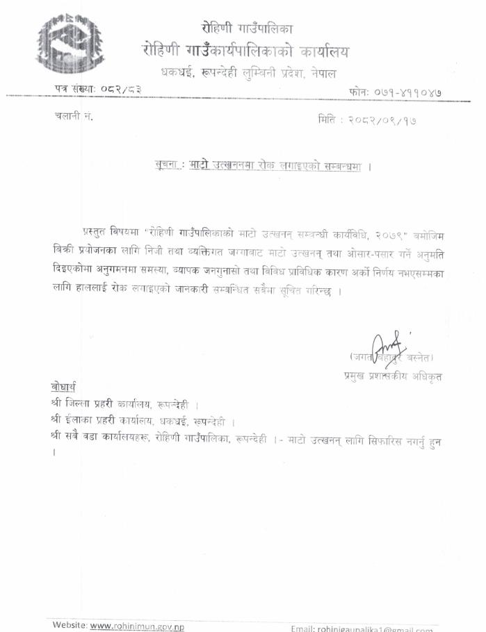 माटो उत्खननमा रोक लगाइएको सम्बन्धमा।